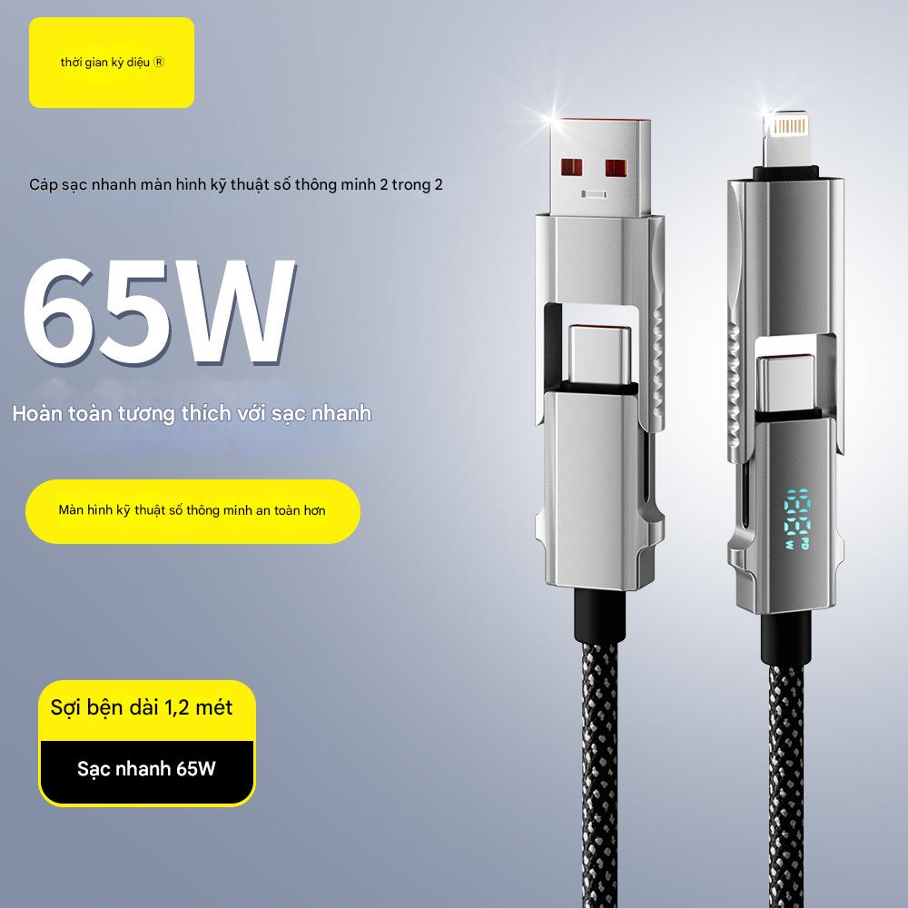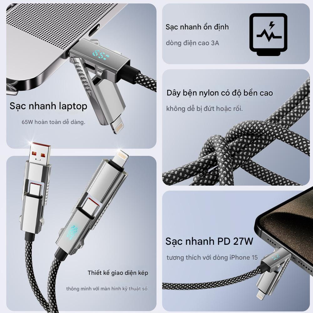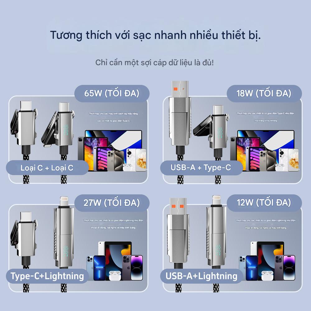 Cáp sạc điện thoại 4 trong 1 công suất sạc nhanh 65W thiết kế đa năng, hỗ trợ nhiều dòng máy khác nhau.